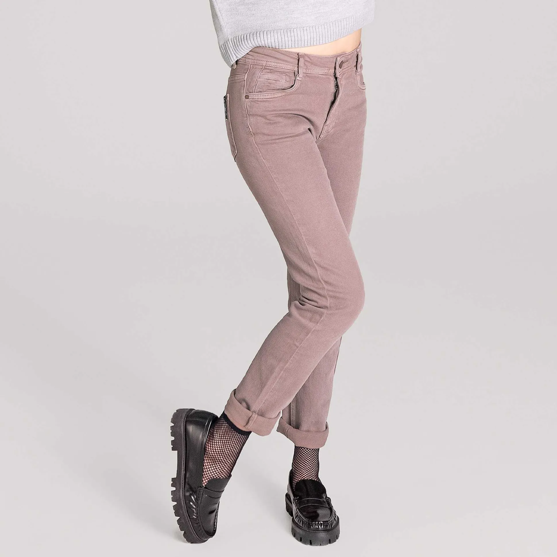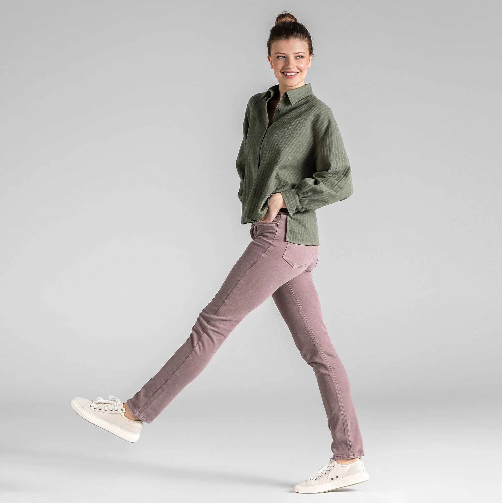 Notre Jean À Teinture Naturelle Avalyn En Kaki Et Mauve, Qui Est Teint À L’Aide D’Un Matériau Particulièrement Respectueux De L’Eau. Technique De Flux D’Air À Base Naturelle, Sont Coupés À Mi-Taille Et Ne Serrent Pas Grâce À La Teneur En Stretch.